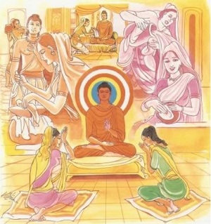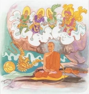 Nói chân thật, không giận hờn, san sẻ cho người xin (*); đó là ba việc lành đưa người đến cõi Chư Thiên.